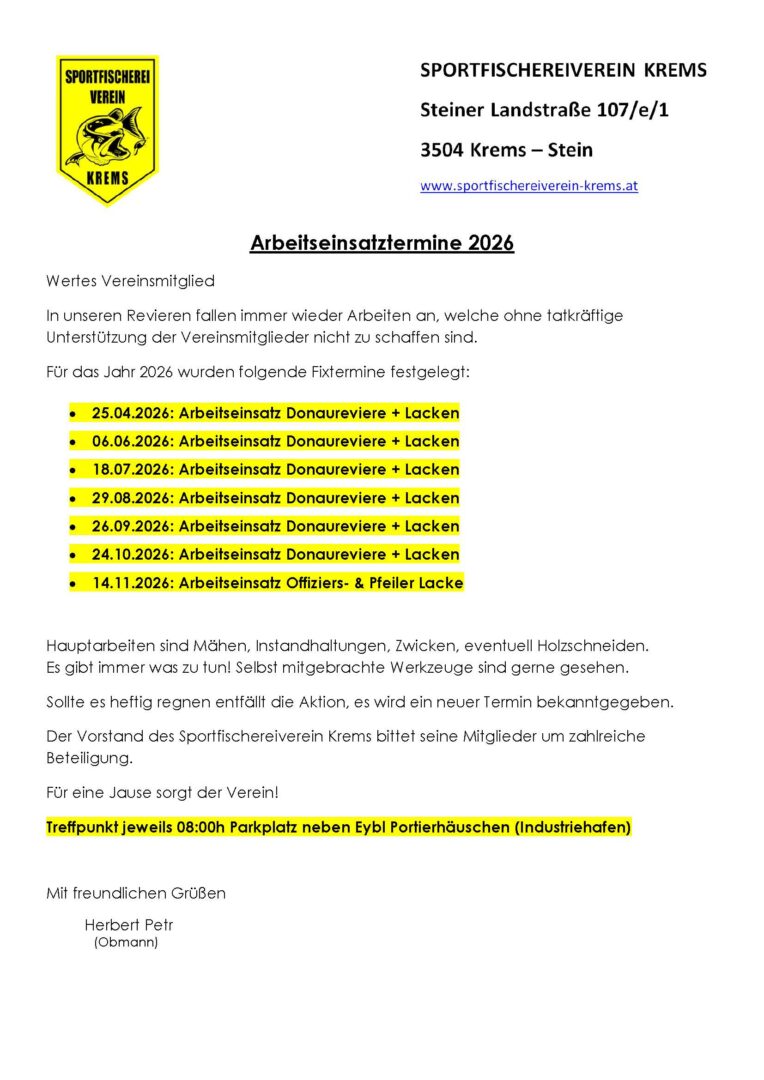 Der Vorstand des Sportfischereiverein Krems bittet seine Mitglieder um zahlreiche Beteiligung.